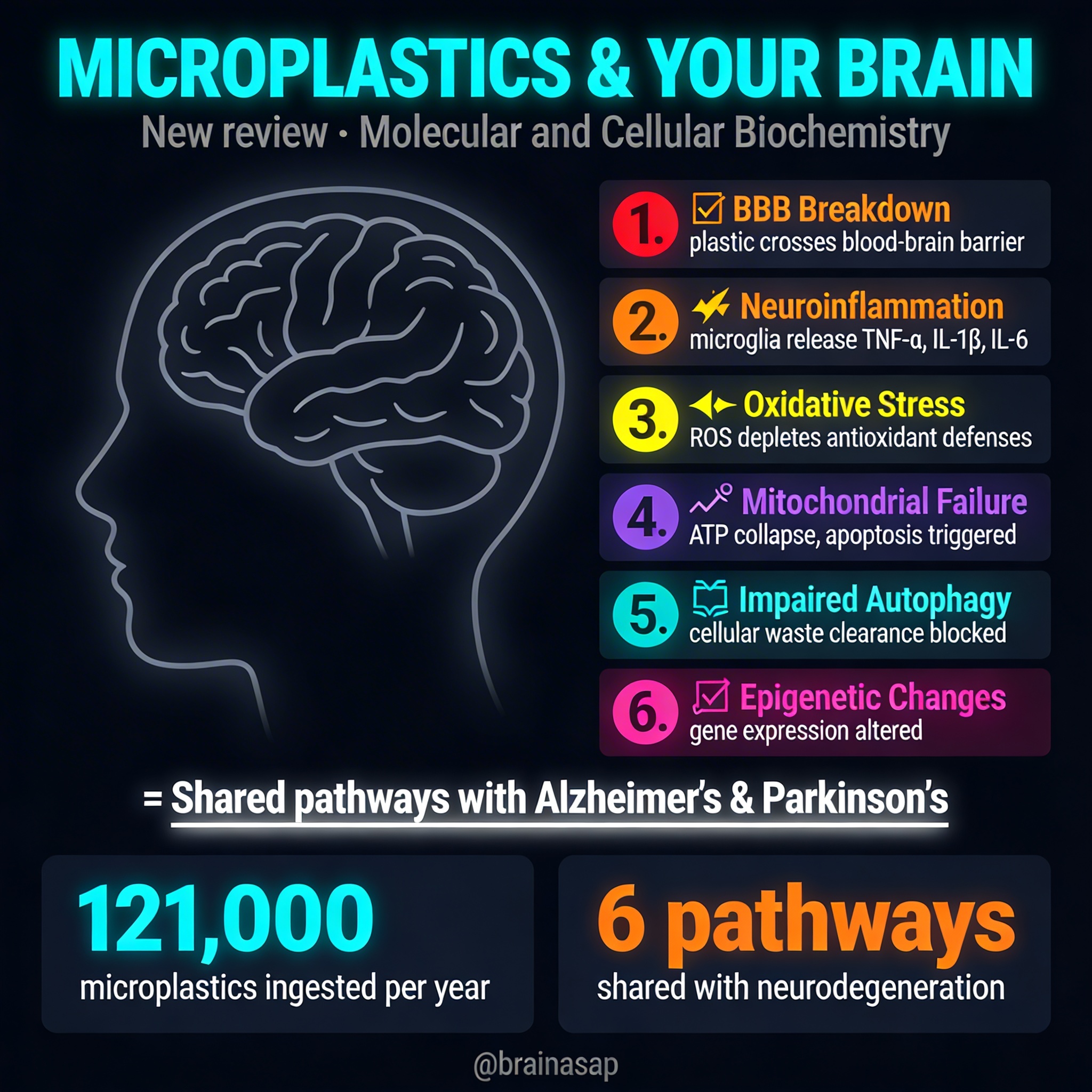 TL;DR: Microplastics circulating in your blood may accelerate Alzheimer’s and Parkinson’s disease through six shared pathways—including blood-brain barrier breakdown, chronic inflammation, and oxidative stress. You probably know plastic pollution is everywhere. Less obvious: tiny plastic fragments are crossing into your brain, accumulating in brain tissue, and potentially triggering neurodegenerative disease. A new review in Molecular …