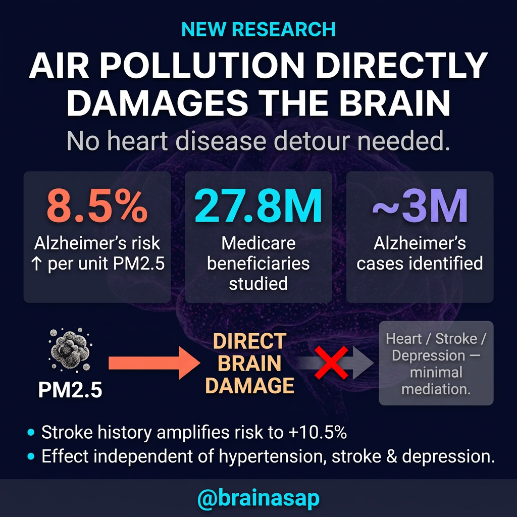 TL;DR: A massive study of 27.8 million Medicare beneficiaries found that exposure to fine air pollution (PM2.5) increases Alzheimer’s risk by 8.5% per unit increase—and this effect operates largely through direct brain damage, not through common health conditions like stroke or depression. The conventional thinking about air pollution and dementia involves a detour through the …