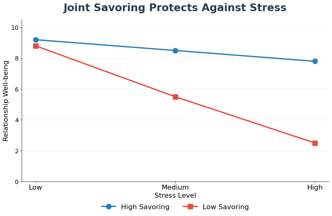 - Stress buffering effect: At low levels of perceived stress, the negative impact on relationship confidence was nearly eliminated for high joint savoring couples compared to low savoring couples (slope = −0.02 vs. −0.10, p < 0.01).