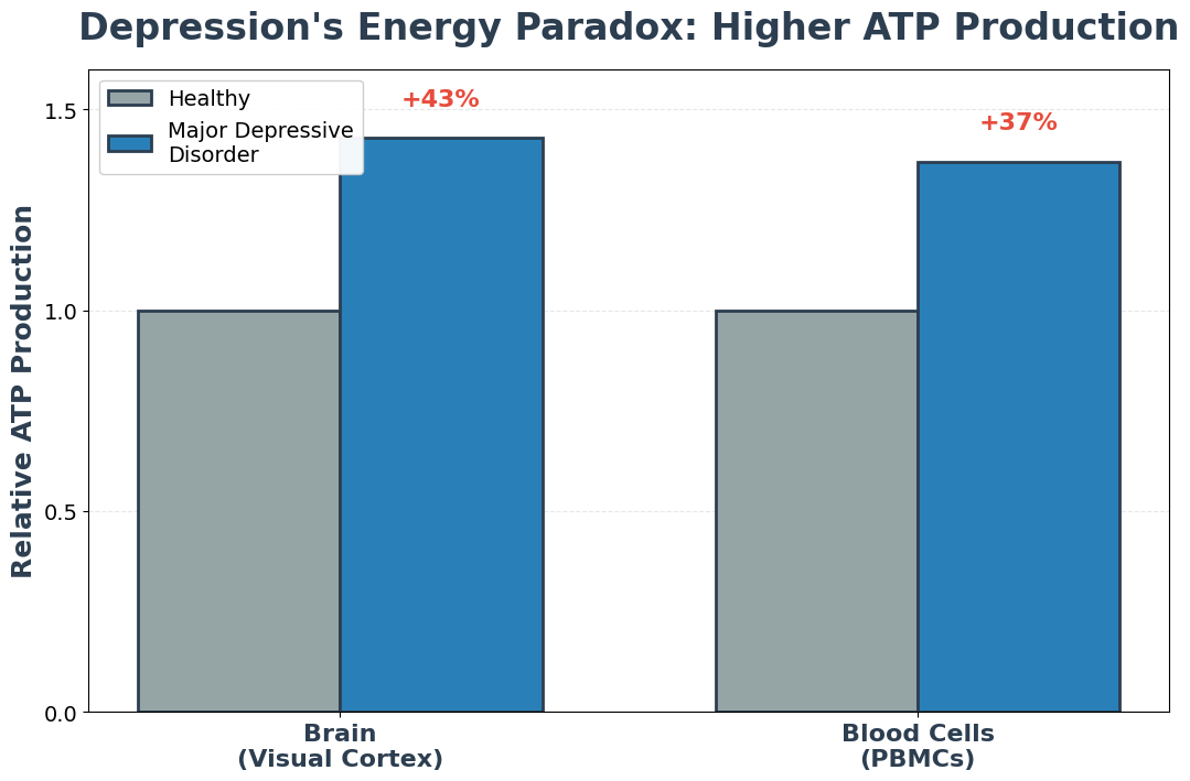 Studies in older adults (ages 50–69) with depression show the opposite pattern: lower ATP levels in blood cells. This suggests a potential disease progression: early upregulation, then eventual collapse into energy deficit and chronic disability. Longitudinal studies will be essential to test this hypothesis.