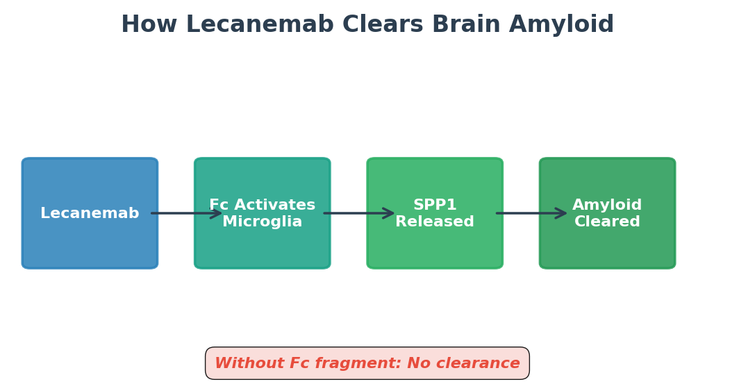1. Fc fragment essential for clearance: Lecanemab’s therapeutic effect requires intact Fc regions that activate microglial receptors; antibodies without functional Fc fragments failed to reduce amyloid plaques despite binding the protein.