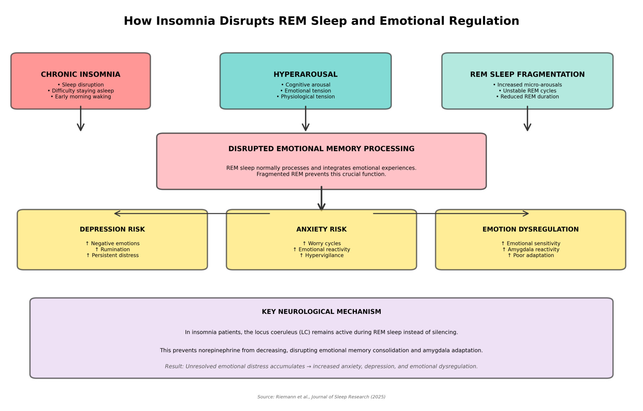 A landmark review from Dieter Riemann and colleagues at the University of Freiburg synthesizes two decades of neuroscience explaining how chronic insomnia fragments REM sleep, preventing emotional memory processing and breeding depression. This mechanism is now clear and measurable.