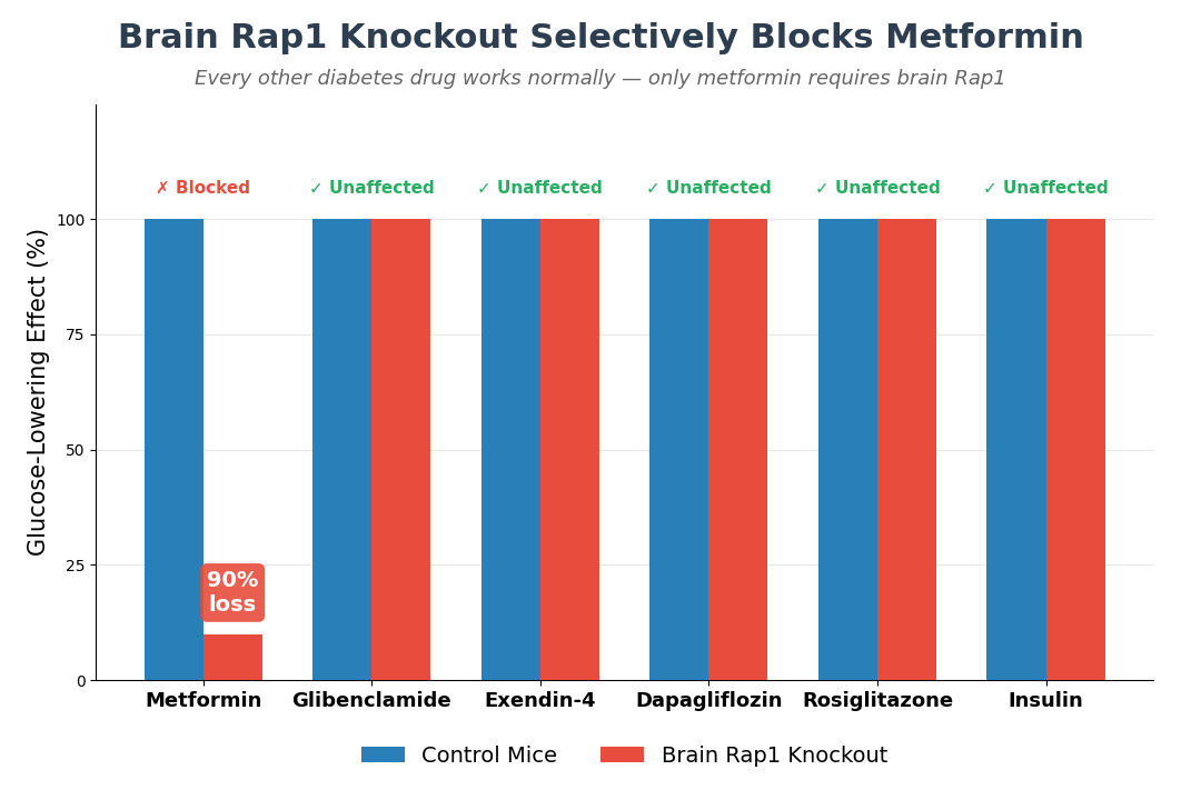 The specificity was striking: metformin engages a Rap1-dependent neural pathway that other drugs bypass entirely.