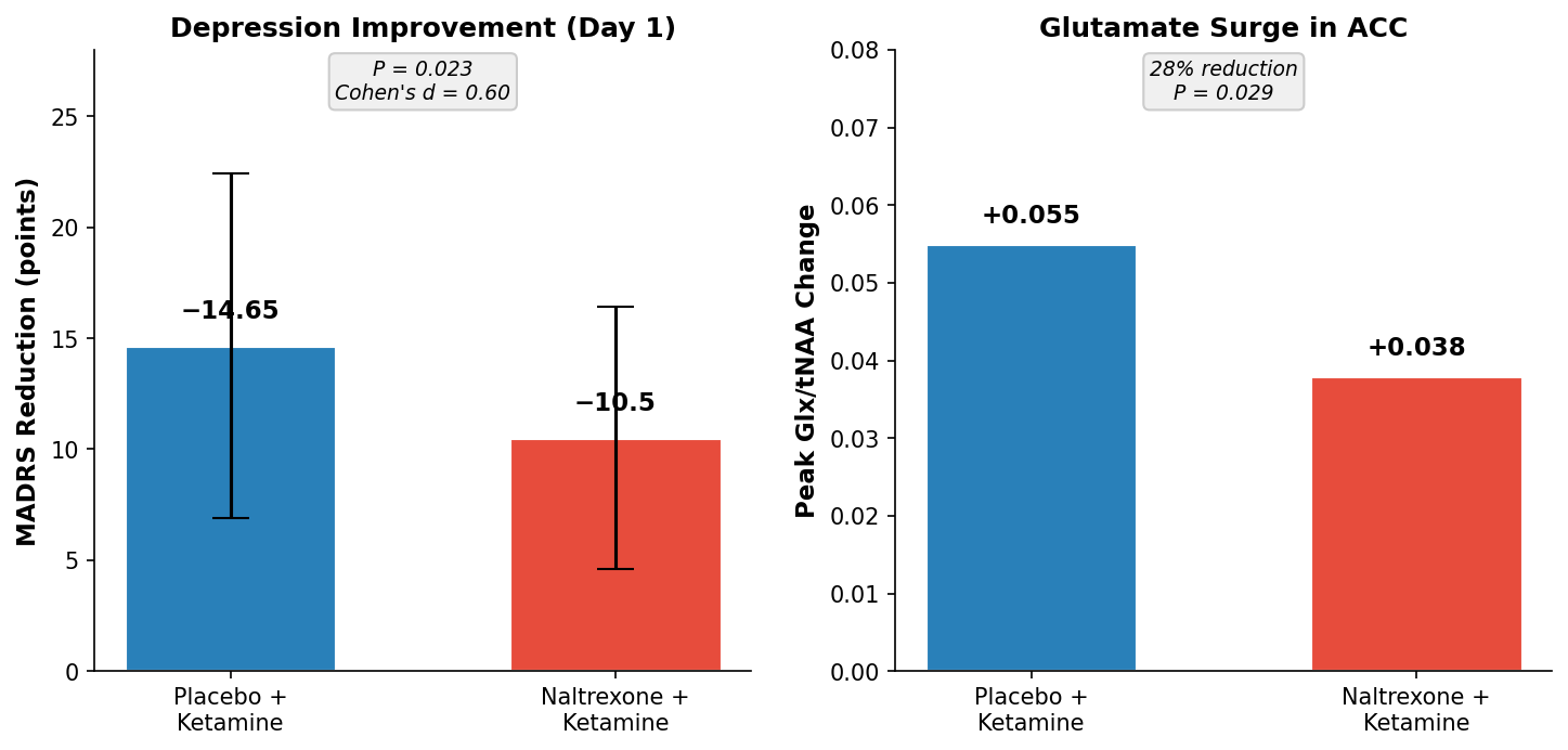 The dampened glutamate surge had consequences. On day 1 post-infusion, naltrexone+ketamine produced significantly less depression relief than placebo+ketamine: