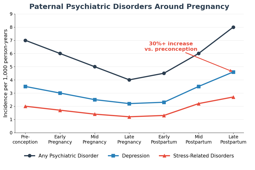 Psychiatric diagnoses actually declined when fatherhood began. In the preconception year, incidence was 7.00 per 1,000 person-years. In late pregnancy, it had fallen to 4.01—a 26 percent reduction that held through the first eight weeks postpartum. Fathers were genuinely getting diagnosed less frequently.