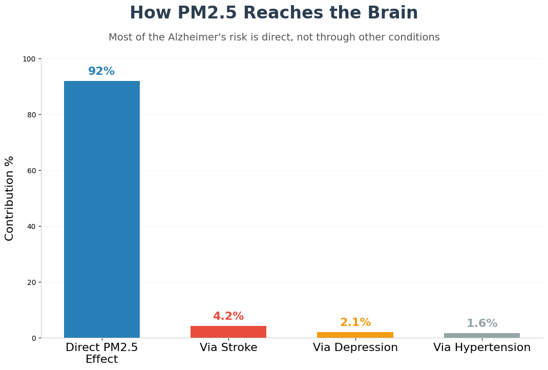 3. Direct pathway dominates: Comorbidities explained only minimal mediation—hypertension mediated 1.6%, stroke 4.2%, and depression 2.1% of the PM2.5–Alzheimer’s association, indicating pollution acts independently of these conditions.
