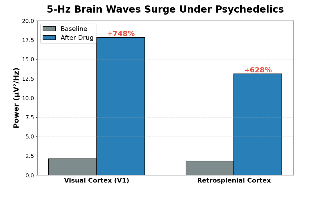 - Psychedelic drugs doubled the rate of spontaneous oscillations: After injecting a 5-HT2A receptor agonist (either DOI or TCB2), the rate of spontaneous 5-Hz episodes jumped from 0.025 to 0.05 episodes per second (p < 0.001), a significant 100% increase in occurrence.
