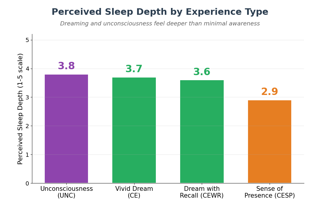 - Dreaming equals unconsciousness for perceived depth: Vivid, immersive dreaming produced perceived sleep depth ratings (β = 0.552) virtually identical to complete unconsciousness (β = 0.593) — the two highest-rated states. The shallowest perceived sleep came not from light sleep, but from a dim awareness of merely existing without dreaming (β = −0.195).