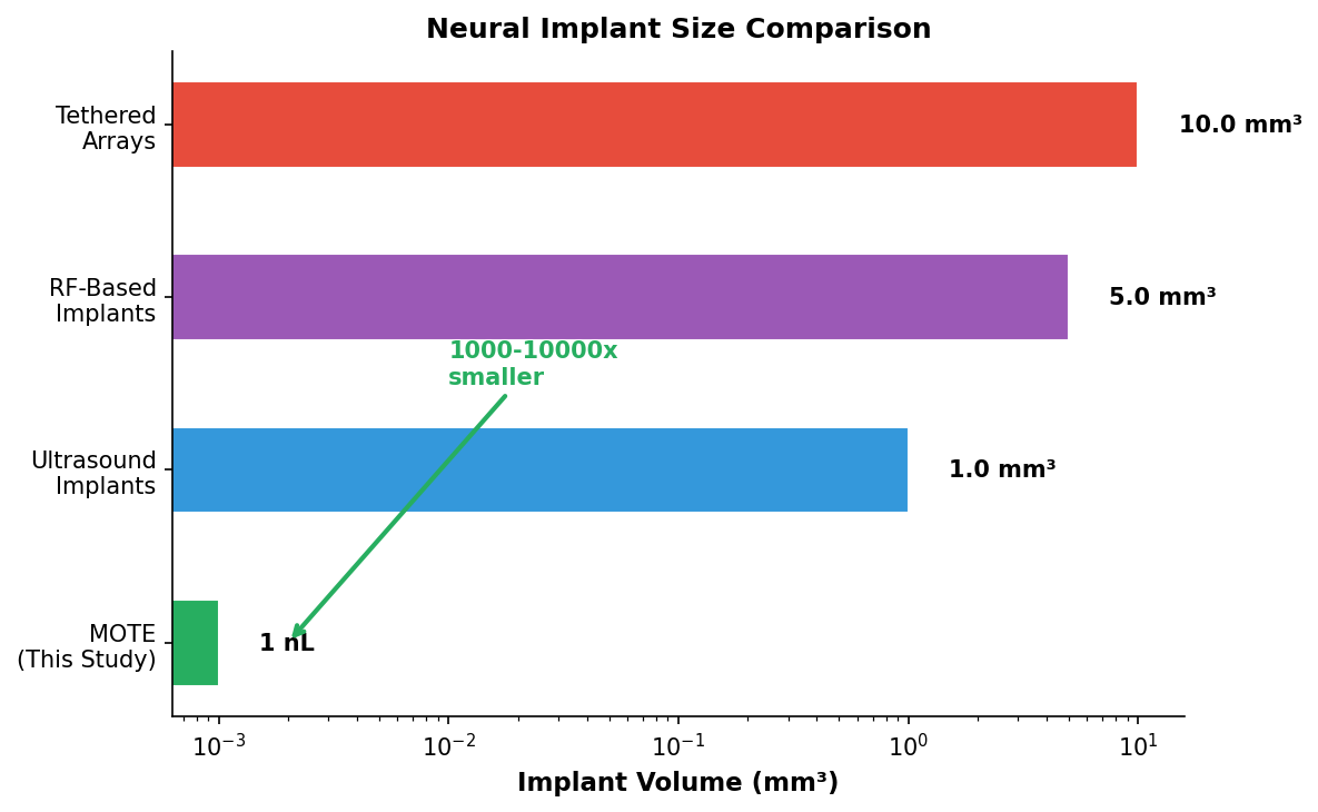 1. MOTE’s total volume is less than 1 nanoliter (less than 0.001 mm³)—orders of magnitude smaller than any previous wireless neural recording device.